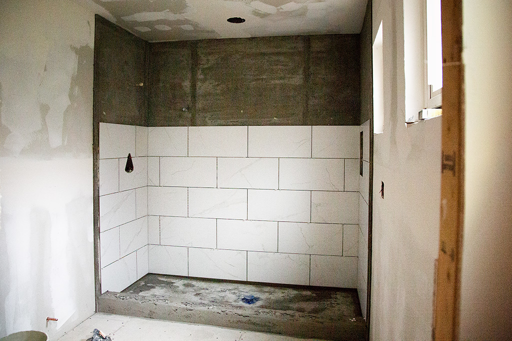 The shower tile (looks a little like prison tile right now) has a marble look, but it is ceramic tile The floor of the shower and the floor of the bathroom will be a gray tone.