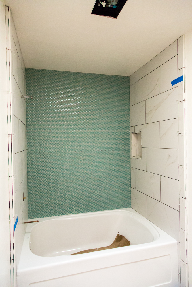What’d I tell you? Of course, the grout is not in yet. It will probably go in tomorrow. That will soften the dark lines and help the penny tiles to pop a little.