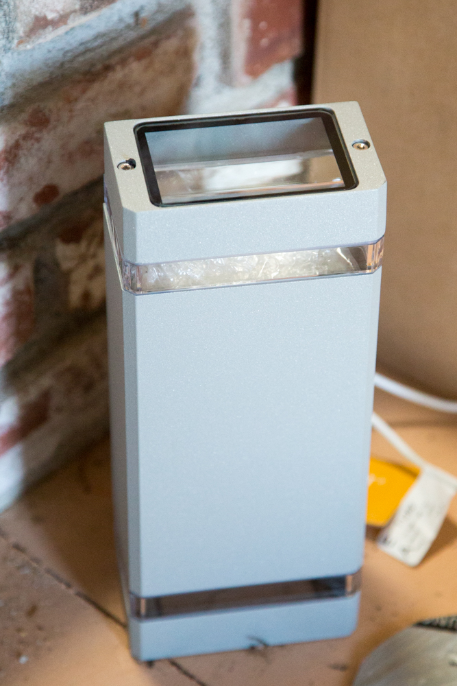This is an up and down light. It shines up and it shines down and then you see a little light in the two little windows. It’s rather unimpressive when there is no light shining thru. Wait till you see it on. (She crosses her fingers.) We will have two of these in this walkway.