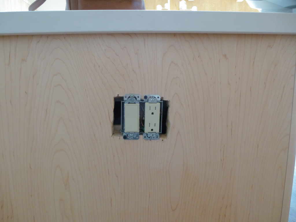 The other day I walked into the house and there was a lonely electrician (one whom I had never seen before) busily working on the island electrical outlet debacle.