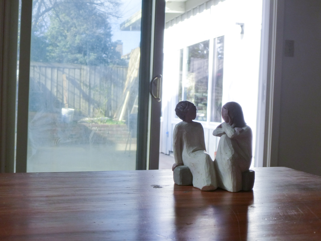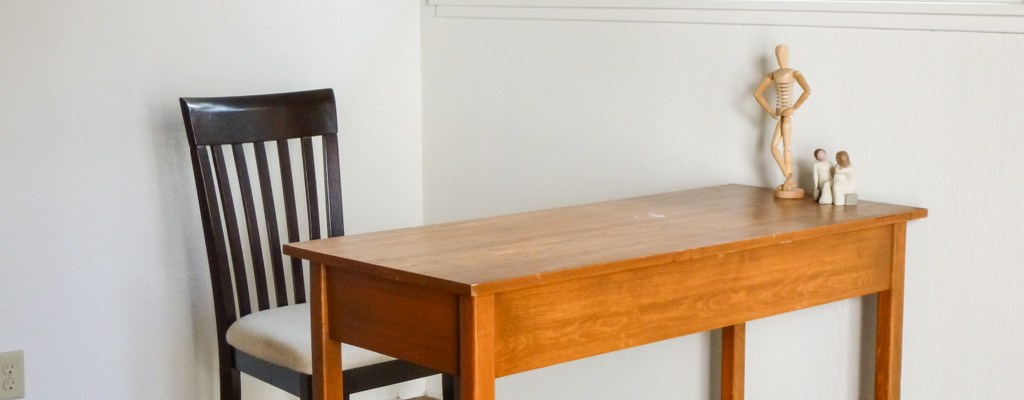 These are the first pieces of furniture that I dragged back into the house from the carport. You can see that although the floors are in, we still need to install baseboards and vent covers. But, I now have a little desk, a chair, and my bendable model…plus a little statue given to me by my best friend.