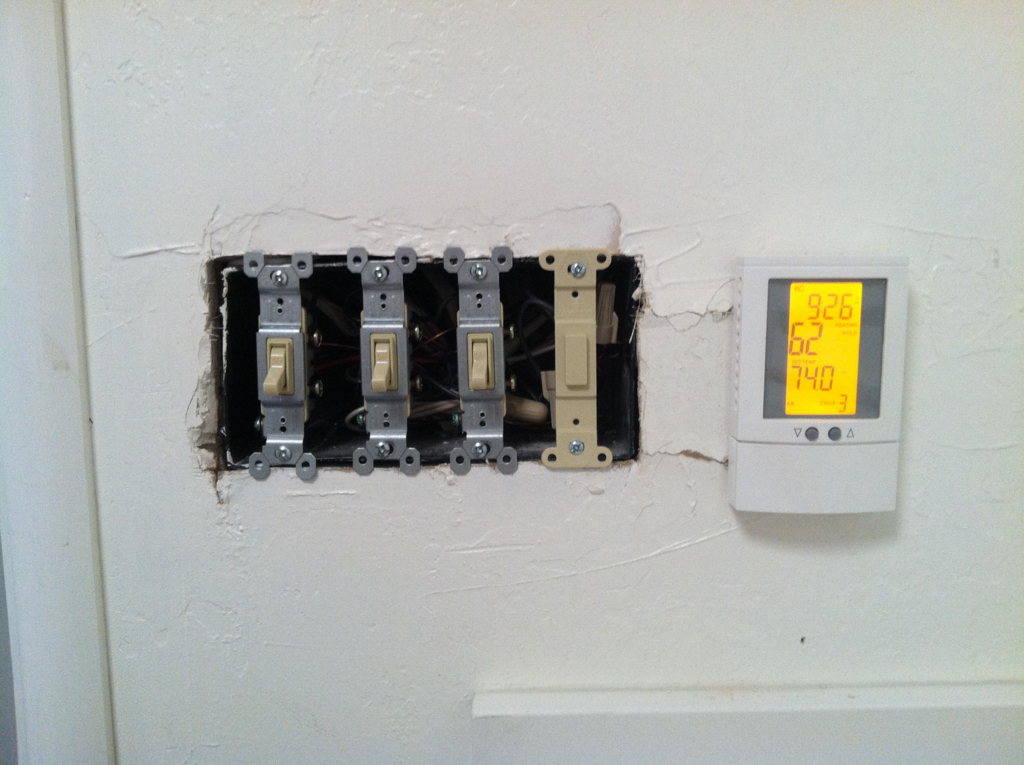 So, I’m pleased with what the electrician has done in these rooms. He also moved the heated floor controls in the bathroom. Here, I’m not so pleased.