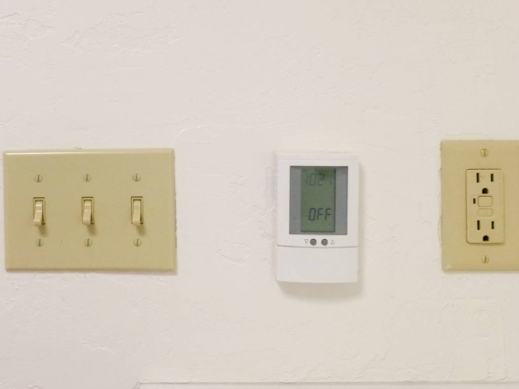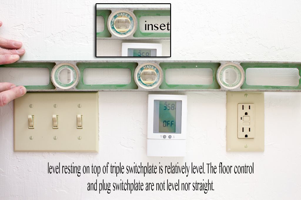 My first thought was that it looked crooked and the tops of the switches were not matched up. My husband also asked them to change out the switch plates to white and to make sure that all the tops of the controls and switch plates lined up. He even put a piece of blue tape across the top so they would see to line them up.