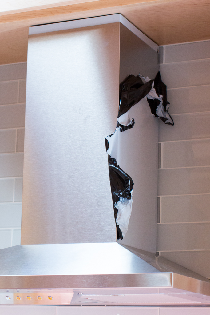 1. The oven hood, although beautiful, was installed without first removing the protective, sticky, plastic covering which was wrapped around the entire hood. We tried to remove it, but found that since some of the plastic covering is between the wall and the hood, we are unable to remove it satisfactorily. Seems like the installers should have removed it before it was installed.