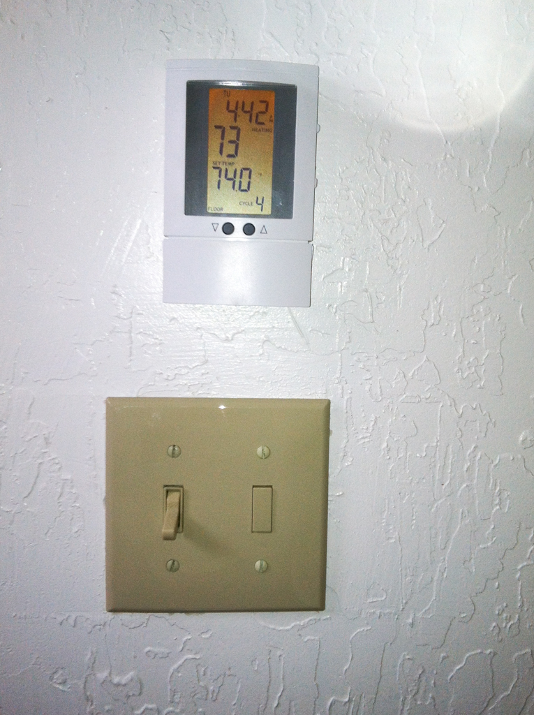 I don’t have a picture of the new configuration of the Master Bath switch plates. But I can tell you that the floor heater control no longer works and they will have to replace it.