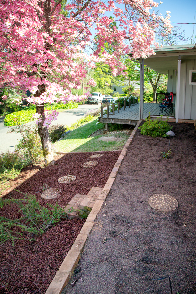 You will see from the above photo that we also pulled weeds, laid down a weed block and then used mulch to cover the area next to the planter and underneath our pretty little dogwood tree.
