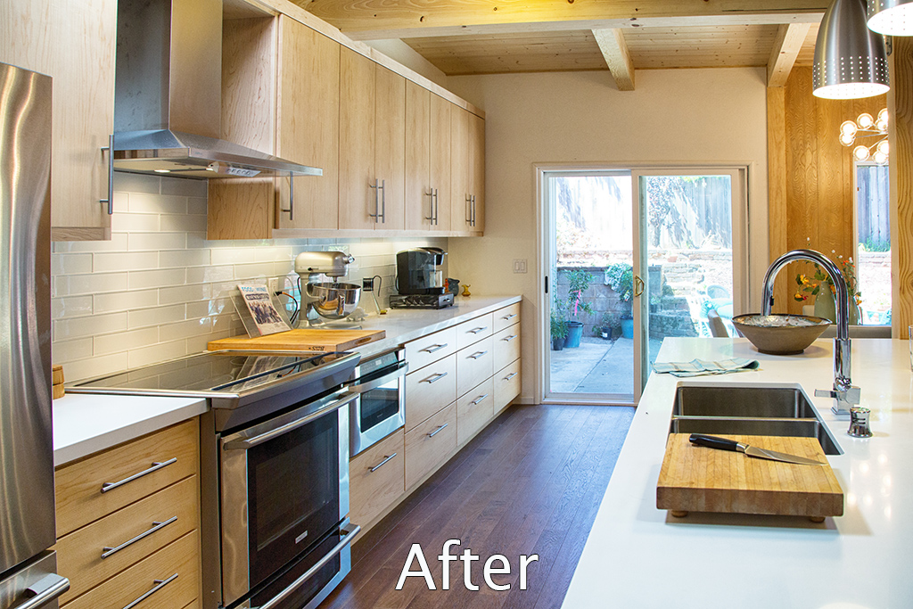 I think this is a good improvement.  The walls were pushed out and the place was gutted. All new cabinets, appliances, floors, electrical and counter tops were installed.  My husband did not want the support post next to the counter, but the engineer said that it was absolutely necessary structurally.